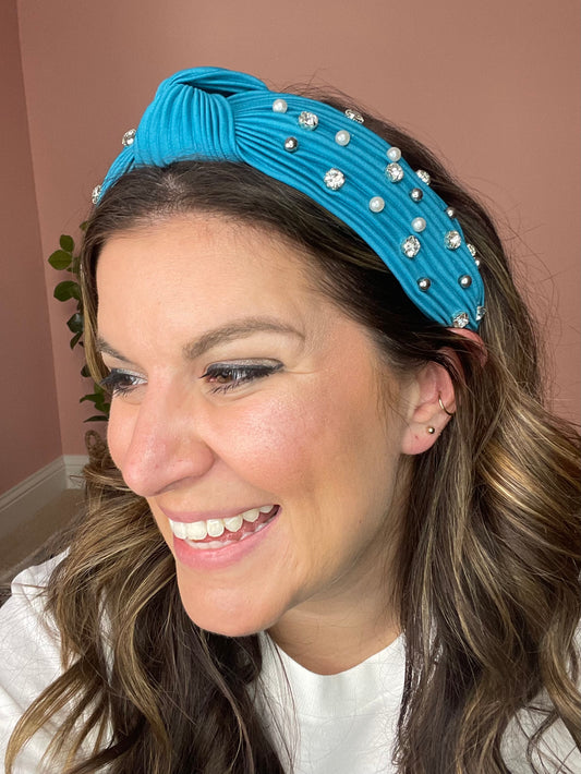 Blue Headband with Pearl and Rhinestone Embellishments