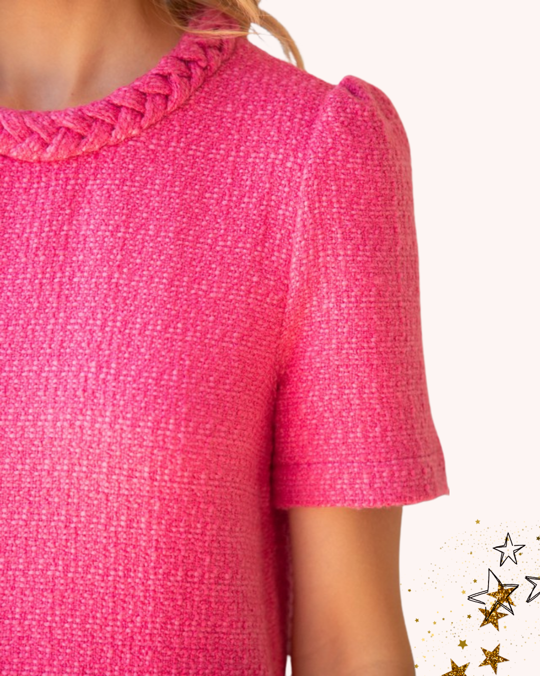 Get ready to fall in love with the Blushing Maple Dress! This tweed shift dress features a braided neck and double pockets for added charm. Perfect for any occasion, this dress will have you feeling stylish and confident.