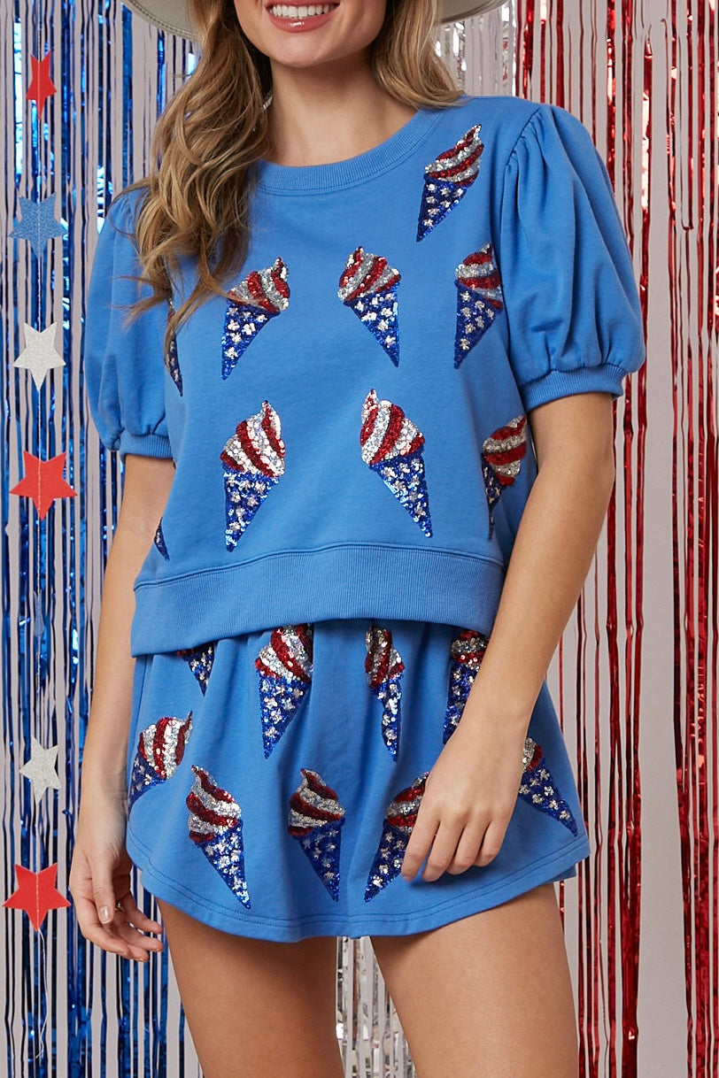 Be the star of any party with our Born To Sparkle Top. Short puff sleeves add a sweet touch while the crop top design keeps it trendy. Rhinestone ice cream embellishments add some sparkle, making you the most patriotic cutie around.
