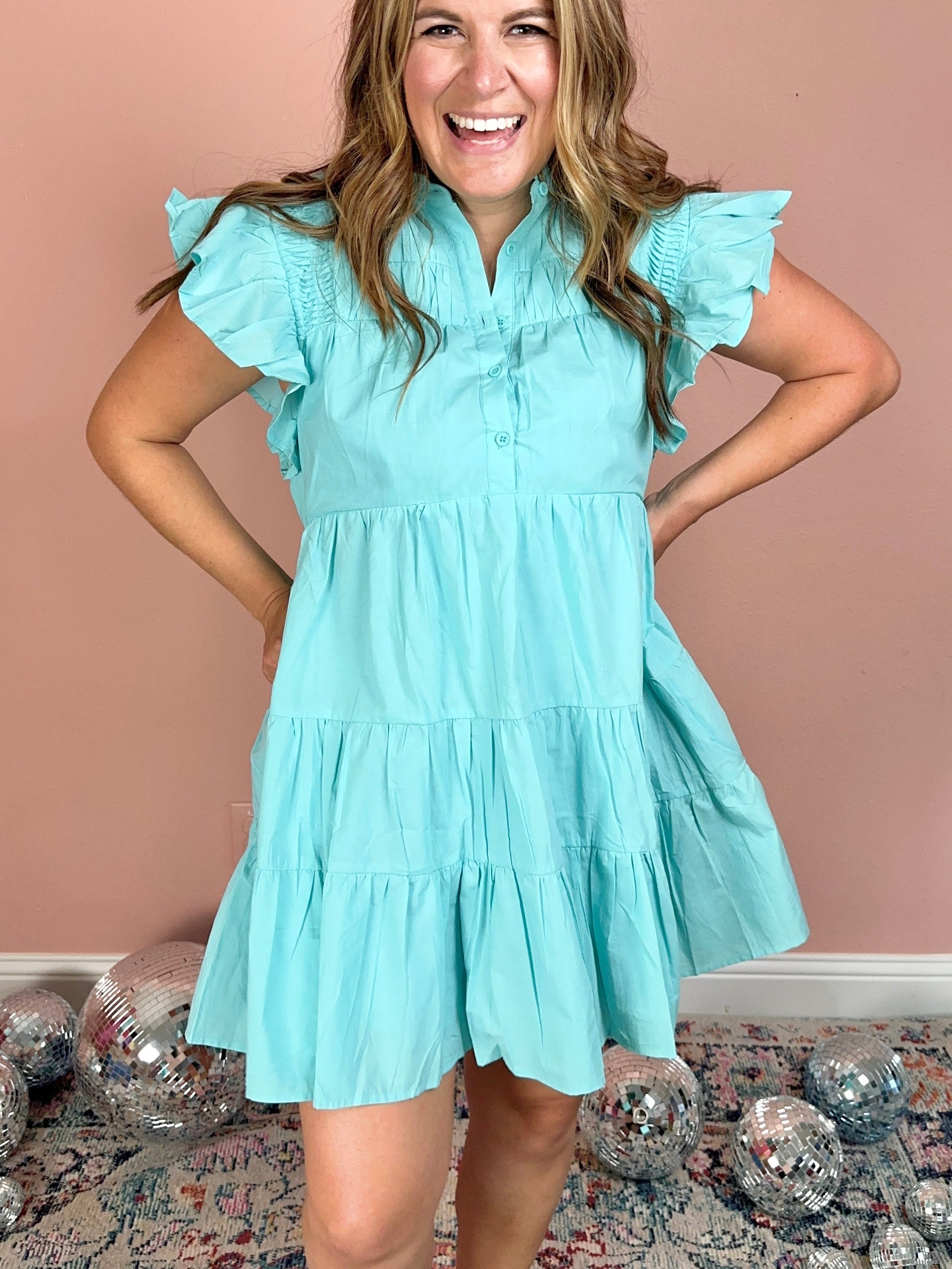 Dance the night away in our Butterfly Kisses Dress! With a ruffled high neck and flutter sleeves, you're sure to steal the spotlight. The tiered mini skirt adds a flirty touch, while pockets provide convenience. Perfect for any occasion, this dress is a must-have for your wardrobe.