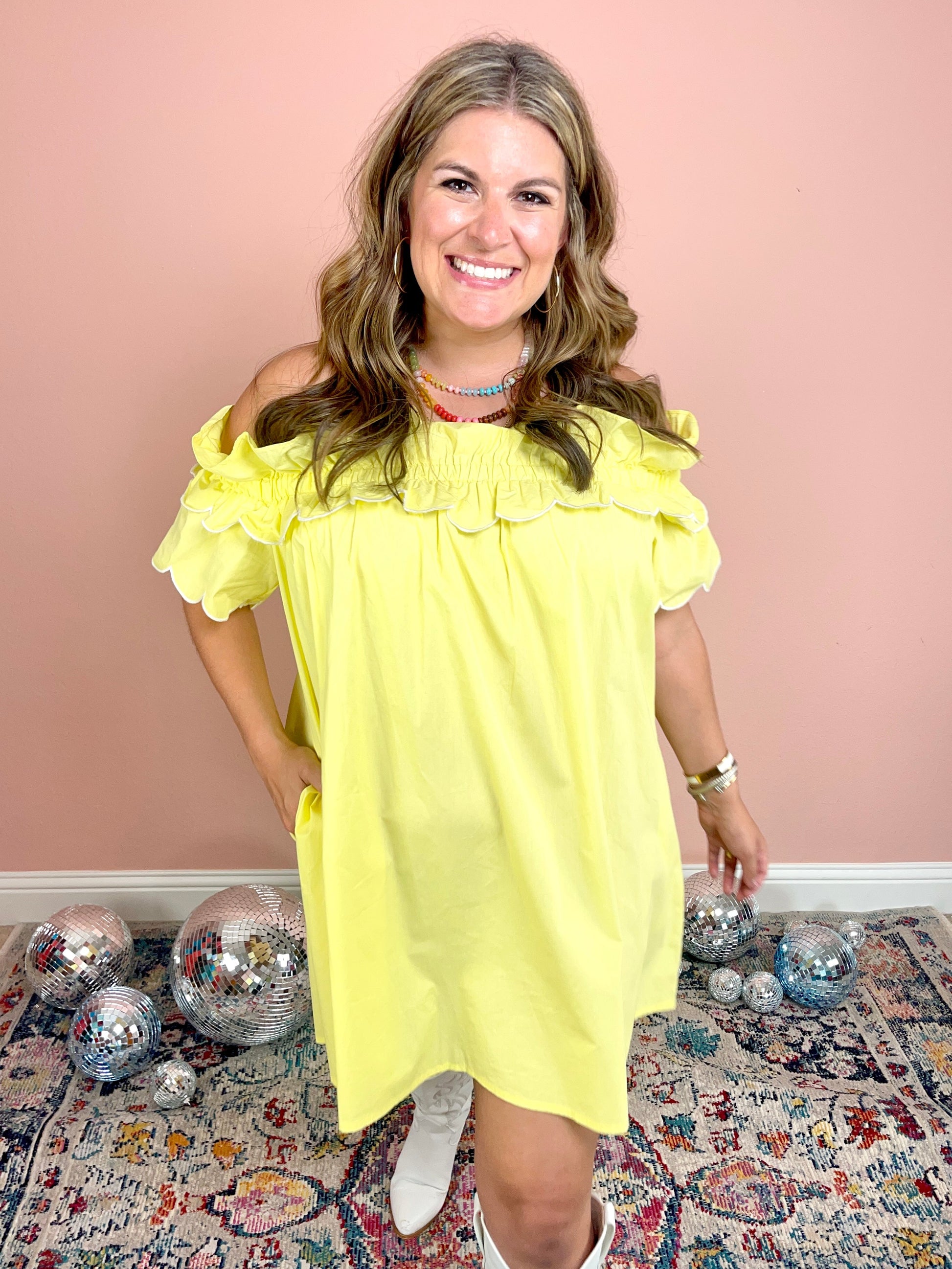 Start your day off right in the Citrus Cutie Dress. This dress is a fun update on this classic silhouette. The scalloped trim adds a feminine flair to this mini dress. Easily dress it up with strappy heels and an oversized sun hat or keep it casual with sneakers and a tote.
