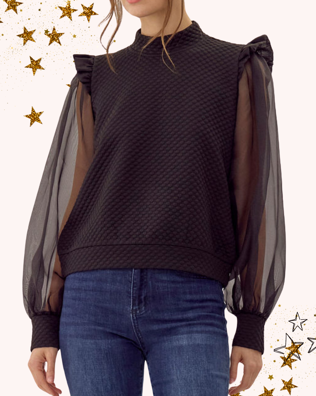 Dress your inner elf in style with our Frosted Holly Top! Featuring a playful mock neck, whimsical frilled shoulders, and charming long puffed sleeves, this top is perfect for holiday parties or spreading some festive cheer. Don't miss out on this winter wardrobe must-have!