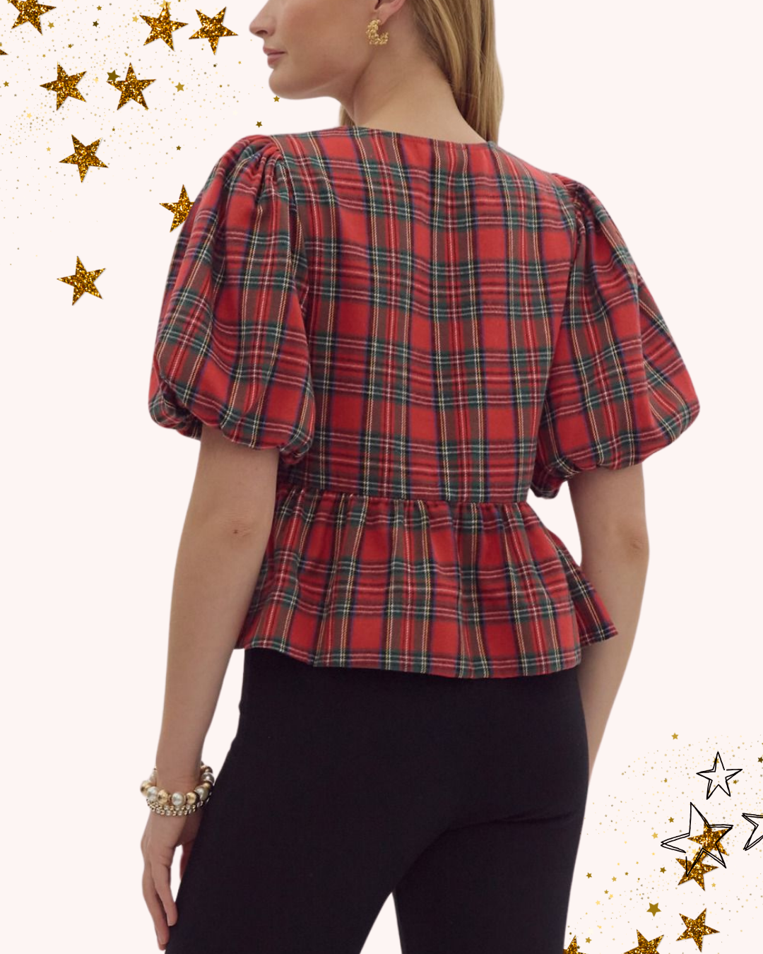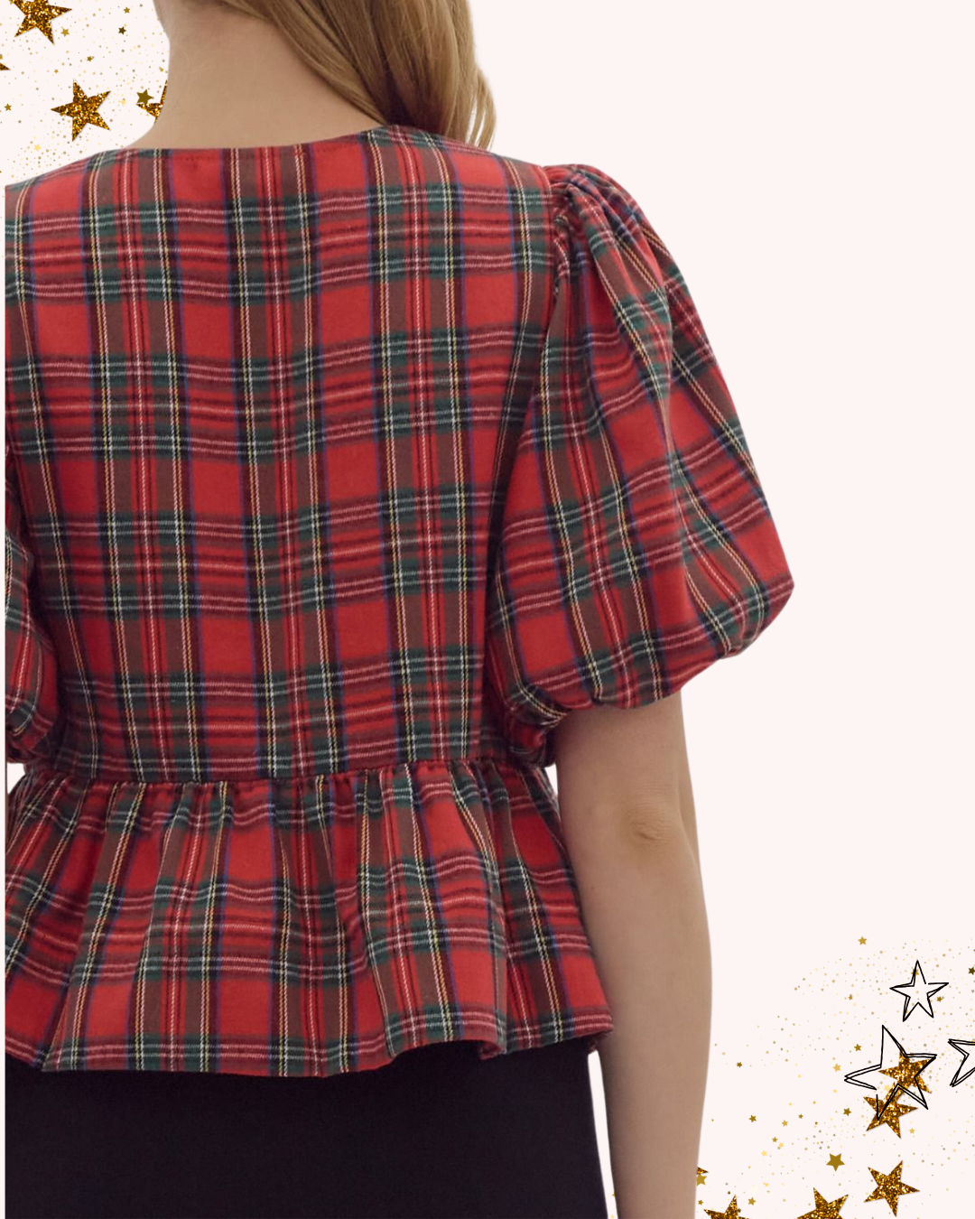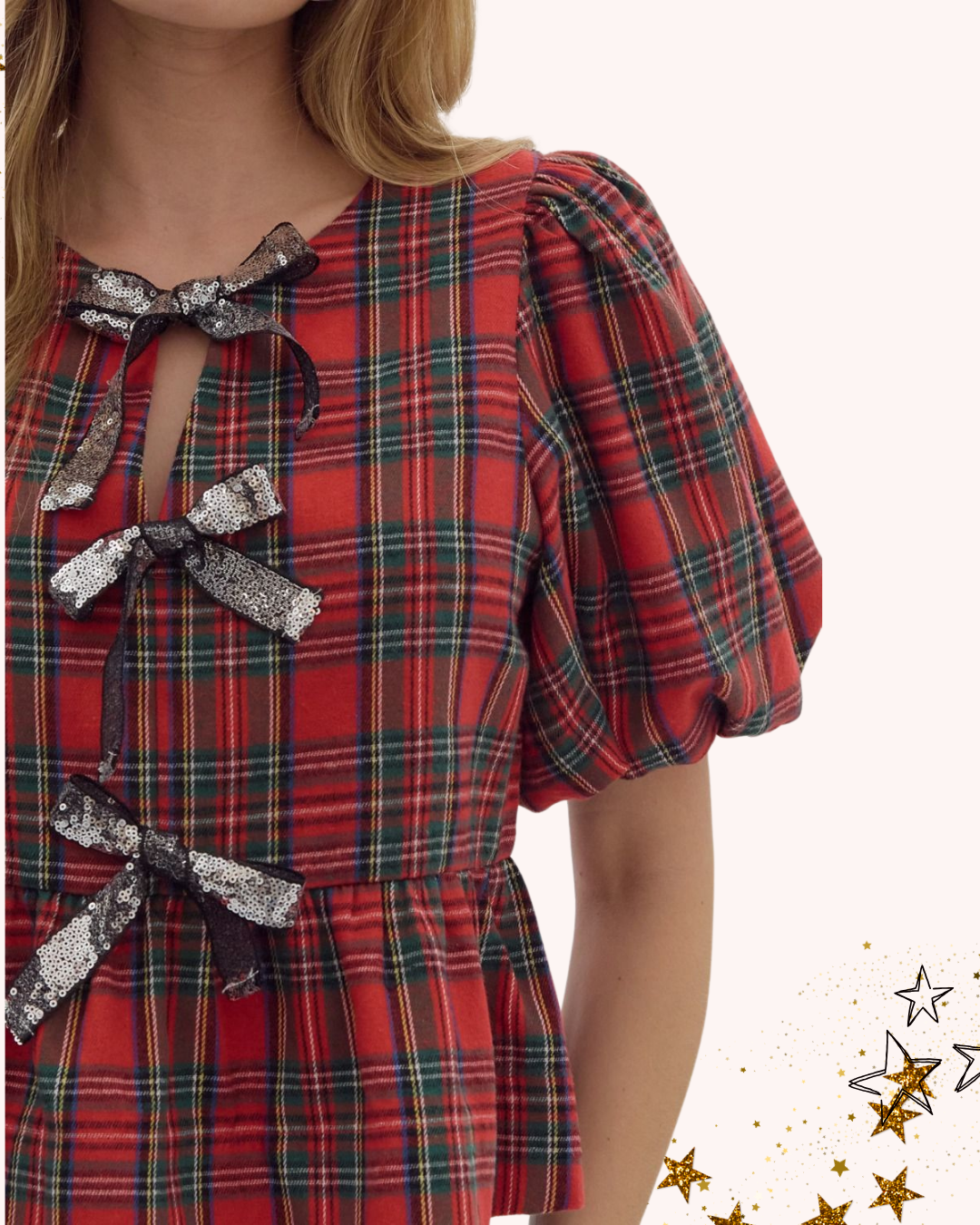 Unleash your inner fashionista with the Glisten and Glow Top. This plaid top features short puff sleeves and a playful sequin bow detail. Its peplum silhouette adds a touch of flirtiness to any outfit. Perfect for those who want to stand out in a unique yet stylish way.